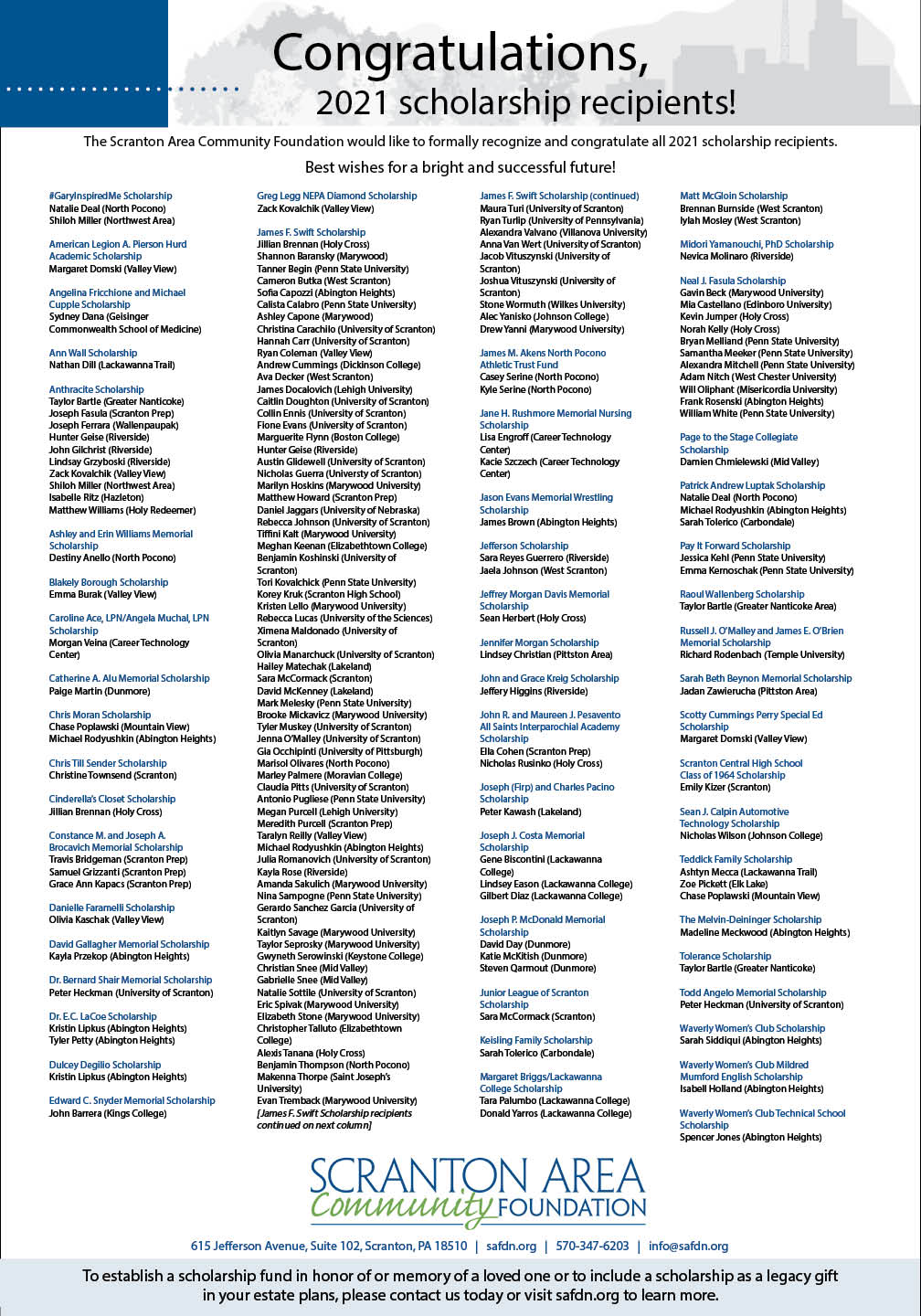 To establish a scholarship fund in honor of or memory of a loved one or to include a scholarship as a legacy gift in your estate plans, please contact the Scranton Area Community Foundation today or visit safdn.org to learn more.