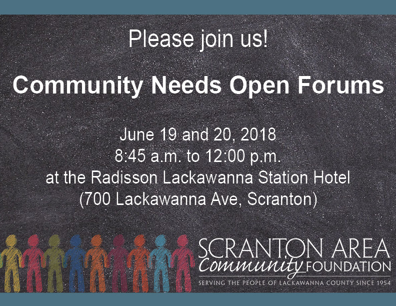 The Scranton Area Community Foundation will host another Community Needs Open Forum on Wednesday, June 20th, 2018 from 8:45 a.m. to 12:00 p.m. at the Radisson Lackawanna Station Hotel in Scranton where nonprofit organizations from Lackawanna County will have the opportunity to each deliver their ten-minute oral presentations on their mission, current needs, and challenges.