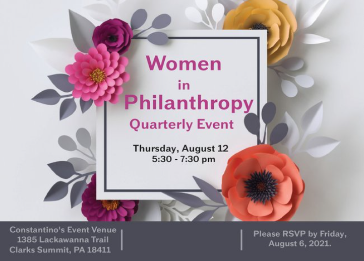 On Thursday, August 12, 2021, Women in Philanthropy’s Quarterly Event will be held from 5:30 – 7:30 pm at Constantino’s Event Venue in Clarks Summit. Join us in person to network, mingle, and hear about all that Women in Philanthropy is accomplishing, because of YOUR support!