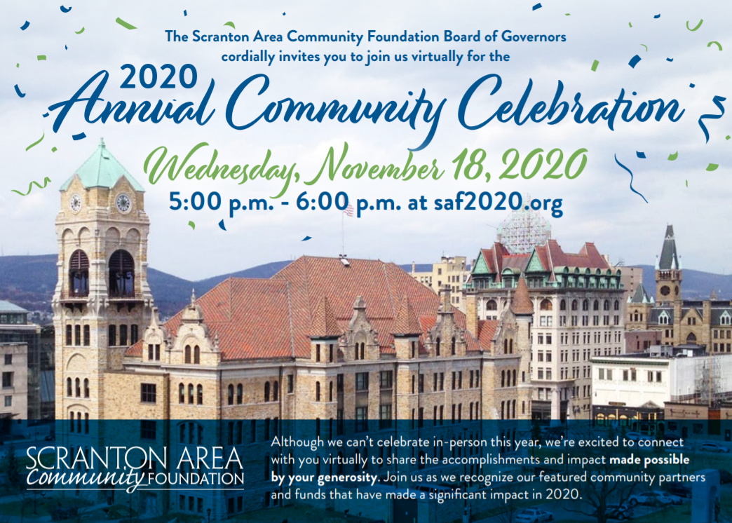 Don't miss our 2020 Annual Community Celebration TONIGHT from 5:00 – 6:00 p.m.! Join us as we also recognize our featured community partners and funds that have made a significant impact in 2020. Our 2020 Featured Community Partners: JOIN THE CELEBRATION PPL Foundation Kathleen Graff Robert H. Spitz Foundation Our 2020 Featured Funds: Heart of Scranton Virtual Fundraiser Fund The...