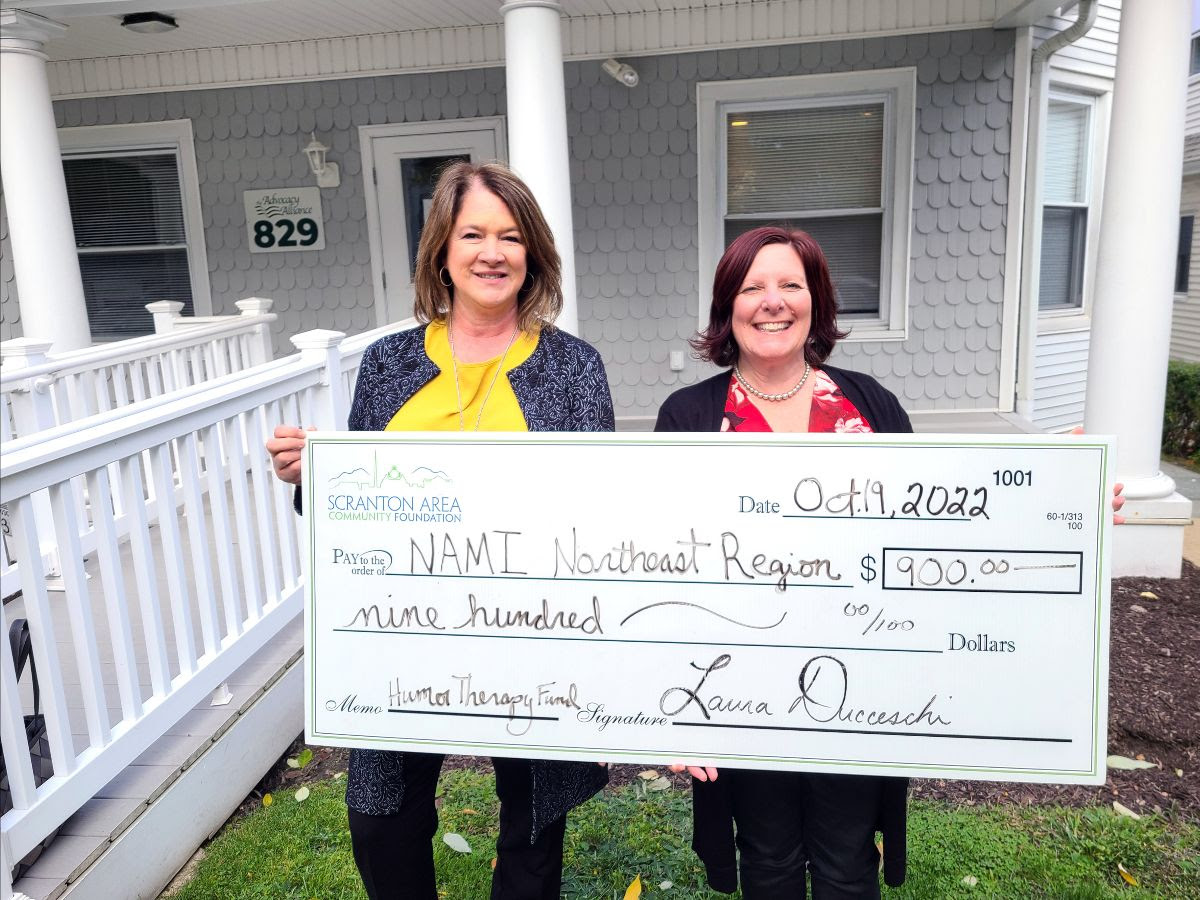 Jeannine Luby, fund advisor to the Humor Therapy Fund at the Scranton Area Community Foundation, recently presented a grant in the amount of $900 to Marie Onukiavage of the National Alliance on Mental Illness (NAMI) Northeast Region of PA, a nonprofit organization focused on mental health. The grant will support a presentation by Gab Bonesso, an award-winning standup comedian, recognized as a Top 100 Speaker in the World on Mental Resilience.