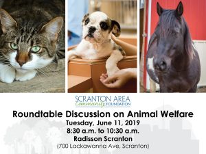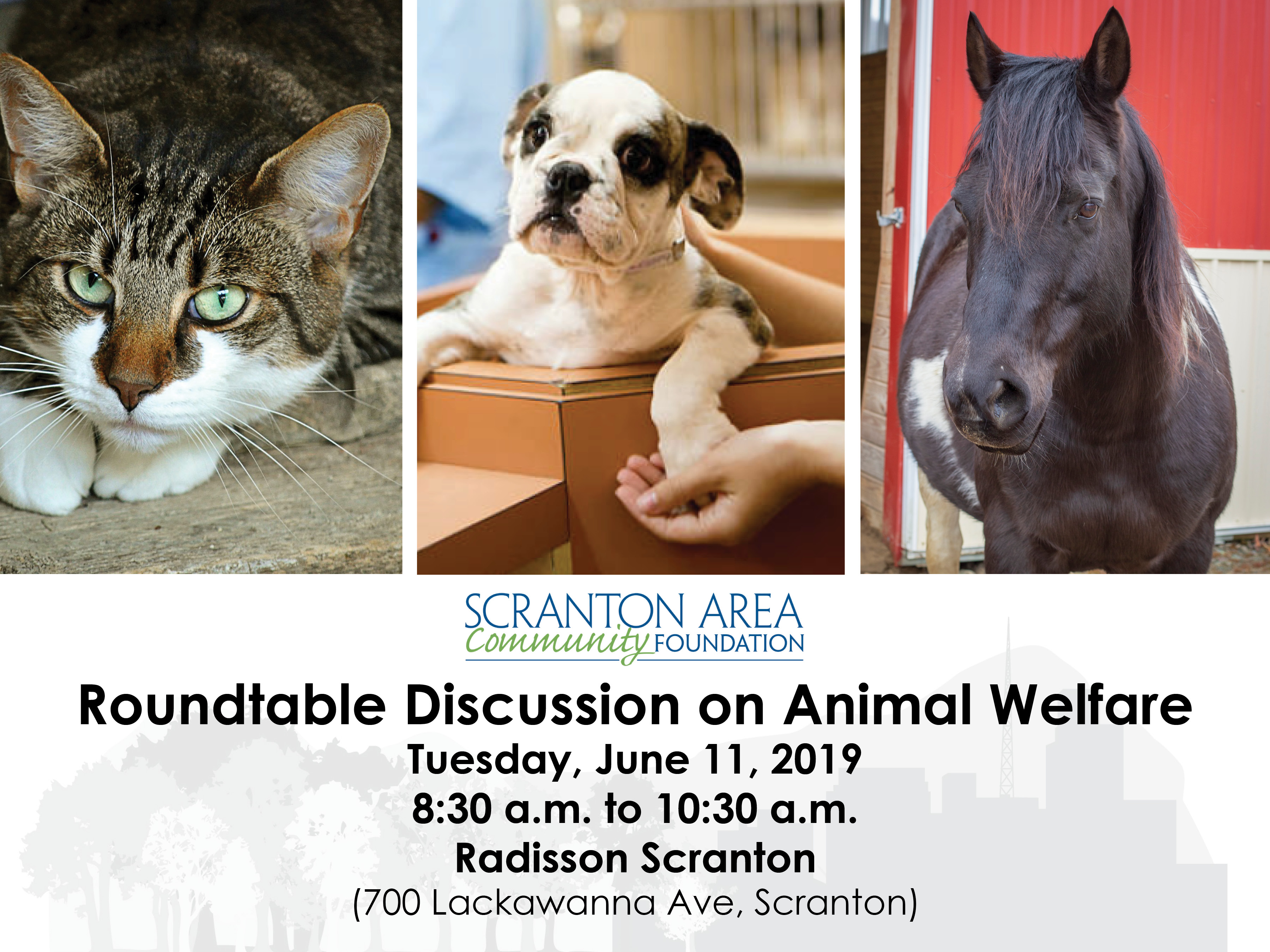 Please join the Scranton Area Community Foundation for a Roundtable Discussion on Animal Welfare on Tuesday, June 11th, from 8:30 a.m. to 10:30 a.m. at the Radisson Scranton (700 Lackawanna Ave, Scranton).