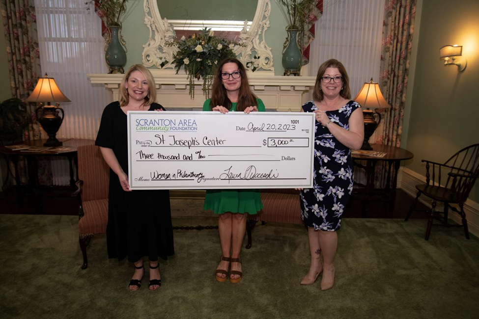 PHOTO: The Women in Philanthropy initiative of the Scranton Area Community Foundation awards a $3,000 grant to St. Joseph’s Center during the Women in Philanthropy Quarterly Meeting and Reception held at the Century Club of Scranton on Thursday, April 20, 2023. (l-r): Tamara Murray Leety, Women in Philanthropy Supporter; Tamara Hall, Director of Maternity/Family Services at Saint Joseph’s Center; and Amy Betts, Women in Philanthropy Supporter and Scranton Area Community Foundation’s Community Initiatives Manager.