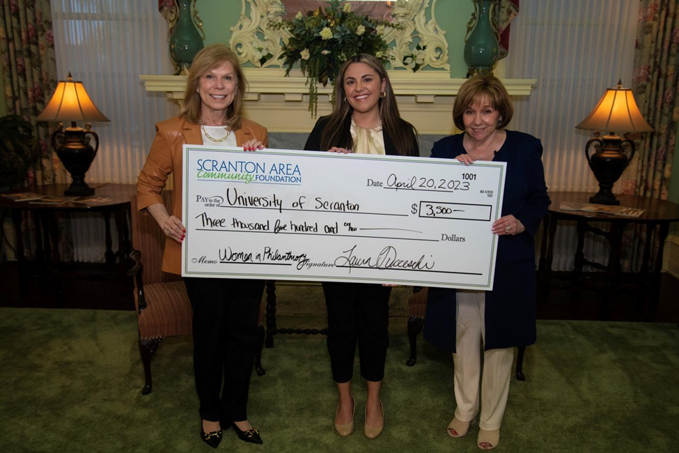 PHOTO: The Women in Philanthropy initiative of the Scranton Area Community Foundation awards a $3,500 grant to the University of Scranton during the Women in Philanthropy Quarterly Meeting and Reception held at the Century Club of Scranton on Thursday, April 20, 2023. (l-r): Patty Thomas, Women in Philanthropy Supporter; Avianna Carilli, Coordinator of Domestic and International Service Programs at the University of Scranton; and Donna Barbetti, Women in Philanthropy Supporter and Board Governor at the Scranton Area Community Foundation.