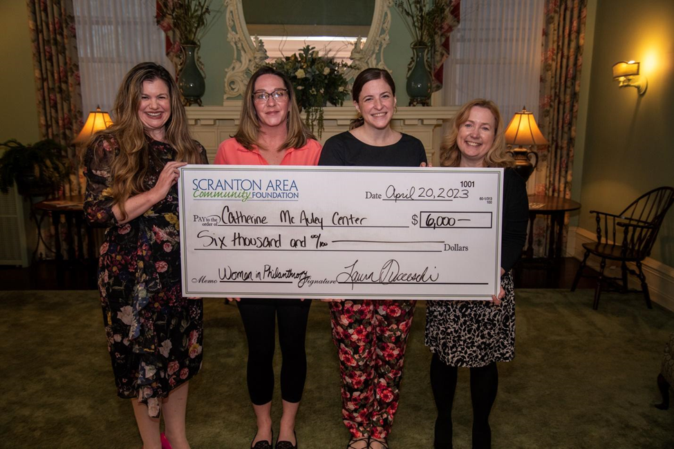 PHOTO: The Women in Philanthropy initiative of the Scranton Area Community Foundation awards a $6,000 grant to the Catherine McAuley Center during the Women in Philanthropy Quarterly Meeting and Reception held at the Century Club of Scranton on Thursday, April 20, 2023. (l-r): Laura Ducceschi, President and CEO of the Scranton Area Community Foundation and Women in Philanthropy Supporter; Ammie Feduchak, Catherine McAuley Center Board Member; Krista Somers Murray, Executive Director of the Catherine McAuley Center; and Jana Nelhybel, Scranton Area Community Foundation’s NEPA Thrives Manager and Women in Philanthropy Supporter.