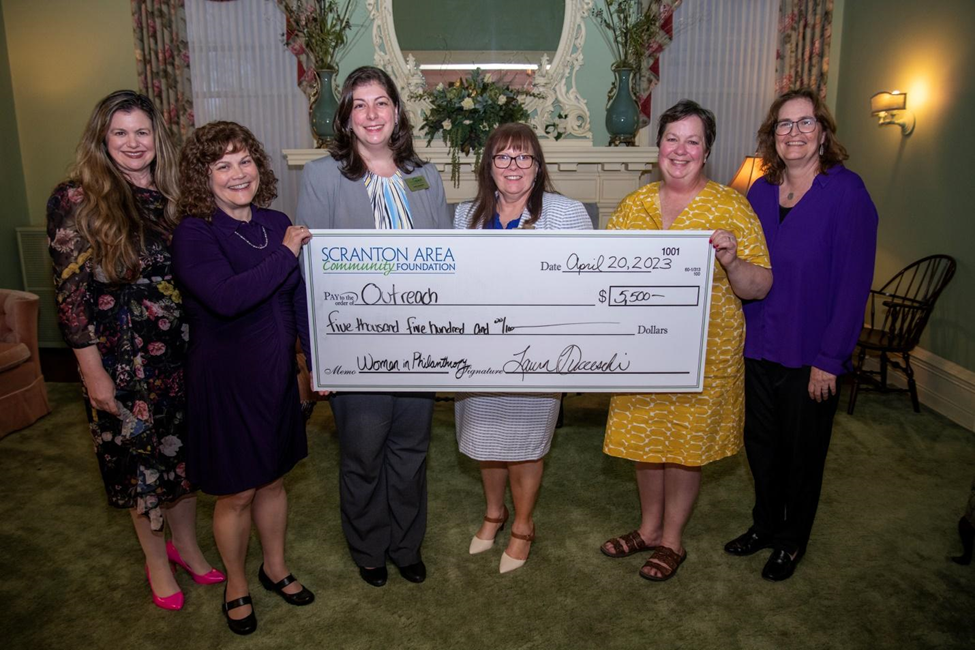 PHOTO: The Women in Philanthropy initiative of the Scranton Area Community Foundation awards a $5,500 grant to Outreach Center for Community Resources during the Women in Philanthropy Quarterly Meeting and Reception held at the Century Club of Scranton on Thursday, April 20, 2023. (l-r): Laura Ducceschi, President and CEO of the Scranton Area Community Foundation and Women in Philanthropy Supporter; Susan Jeffery, Women in Philanthropy Supporter; Lori Chaffers, Executive Director of Outreach Center for Community Resources; Liz Ratchford, Development Director of Outreach for Community Resources; Dawn Talley, Women in Philanthropy Supporter; and Ellen Burkey, Women in Philanthropy Supporter and Board Vice Chair of the Scranton Area Community Foundation.