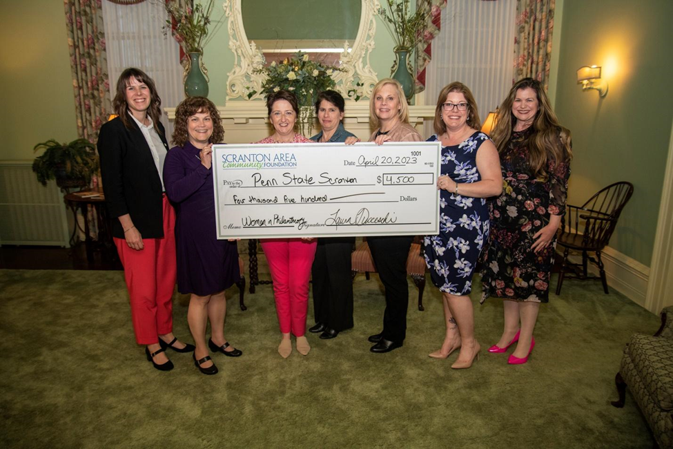 PHOTO: The Women in Philanthropy initiative of the Scranton Area Community Foundation awards a $4,500 grant to Penn State Scranton during the Women in Philanthropy Quarterly Meeting and Reception held at the Century Club of Scranton on Thursday, April 20, 2023. (l-r): Ryanne Jennings, Women in Philanthropy Supporter; Susan Jeffery, Women in Philanthropy Supporter; Shelly Egan, Principal at Old Forge School District; Dr. Melissa Labuda, Assistant Teaching Professor at Penn State Scranton; Christine Ostroski, Director of Development at Penn State Scranton; Amy Betts, Women in Philanthropy Supporter and Scranton Area Community Foundation’s Community Initiatives Manager; Laura Ducceschi, Women in Philanthropy Supporter and President and CEO of the Scranton Area Community Foundation.
