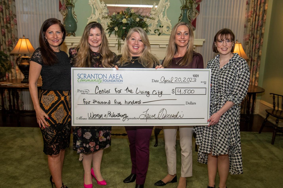 PHOTO: The Women in Philanthropy initiative of the Scranton Area Community Foundation awards a $4,500 grant to Center for the Living City during the Women in Philanthropy Quarterly Meeting and Reception held at the Century Club of Scranton on Thursday, April 20, 2023. (l-r): Donna Nelson, Women in Philanthropy Supporter; Laura Ducceschi, Women in Philanthropy Supporter and President and CEO of the Scranton Area Community Foundation; Maria MacDonald, Center for the Living City Executive Director; Sarah Effertz, Women in Philanthropy Supporter; and Bella Ceccoli, Scranton Area Community Foundation’s Administrative Coordinator and Women in Philanthropy Supporter.