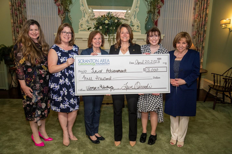 PHOTO: The Women in Philanthropy initiative of the Scranton Area Community Foundation awards a $3,000 grant to Junior Achievement during the Women in Philanthropy Quarterly Meeting and Reception held at the Century Club of Scranton on Thursday, April 20, 2023. (l-r): Laura Ducceschi, Women in Philanthropy Supporter and President and CEO of the Scranton Area Community Foundation; Amy Betts, Women in Philanthropy Supporter and Scranton Area Community Foundation’s Community Initiatives Manager; Fran Langan, Women in Philanthropy Supporter; Susan Magnotta, President of Junior Achievement of Northeastern PA; Bella Ceccoli, Scranton Area Community Foundation’s Administrative Coordinator; and Donna Barbetti, Women in Philanthropy Supporter and Board Governor at the Scranton Area Community Foundation.
