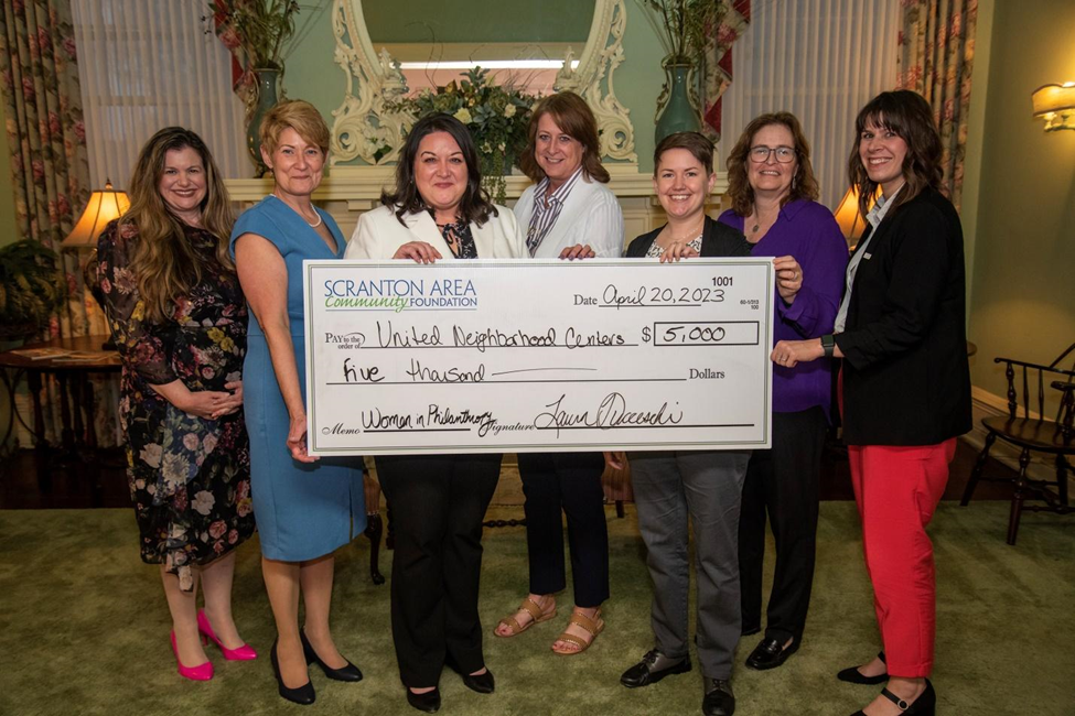 PHOTO: The Women in Philanthropy initiative of the Scranton Area Community Foundation awards a $5,000 grant to United Neighborhood Centers of NEPA during the Women in Philanthropy Quarterly Meeting and Reception held at the Century Club of Scranton on Thursday, April 20, 2023. (l-r): Laura Ducceschi, Women in Philanthropy Supporter and President and CEO of the Scranton Area Community Foundation; Dr. Patricia Fox, Women in Philanthropy Supporter and Board Governor at the Scranton Area Community Foundation; Lisa Durkin, President and CEO of United Neighborhood Centers of NEPA; Laurie LaMaster, United Neighborhood Centers of NEPA Director of Development and Communications; Kelly Langan, United Neighborhood Centers of NEPA Director of Children and Teens; Ellen Burkey, Women in Philanthropy Supporter and Board Vice Chair of the Scranton Area Community Foundation; Ryanne Jennings, Women in Philanthropy Supporter.